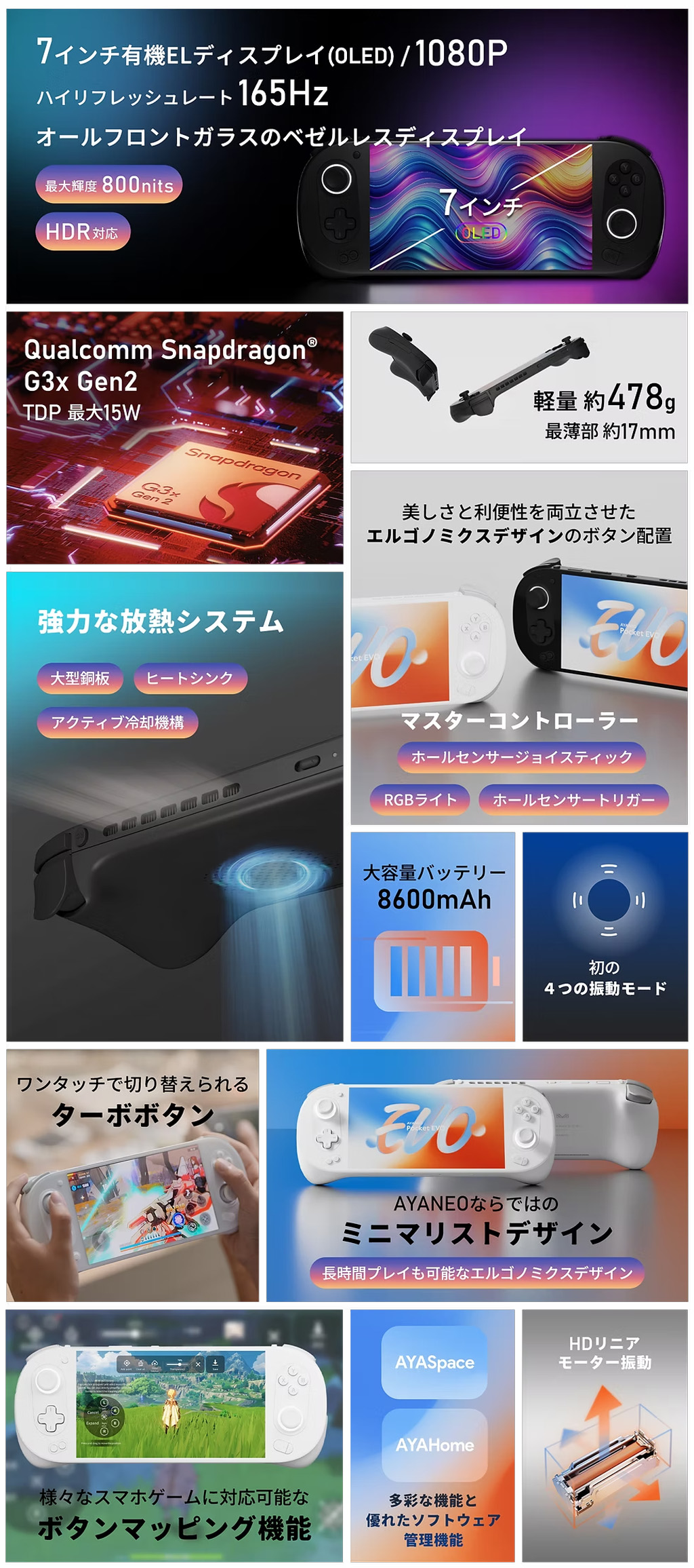 Androidゲーミングデバイスをリードする性能を持つ「AYANEO Pocket EVO」。有機EL(OLED)ディスプレイを搭載し、まばゆい色彩と立体感のある映像を実現します。他のAndroidゲーミングデバイスの中でもトップレベルの高リフレッシュレート 165Hzと、優れたゲーム体験をユーザーに提供します。